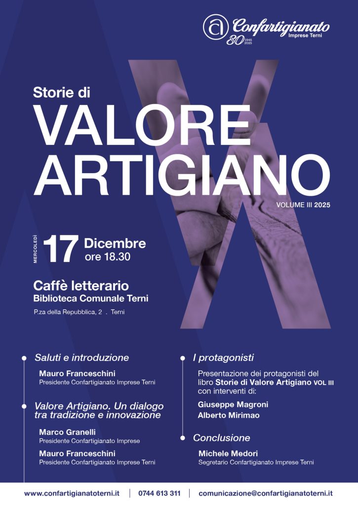 Confartigianato Imprese Terni presenta “Storie di Valore Artigiano – Volume III (2025)”, il nuovo capitolo del progetto dedicato alla valorizzazione delle imprese artigiane del territorio. L’evento si terrà mercoledì 17 dicembre alle ore 18.30 presso il Caffè Letterario della Biblioteca Comunale di Terni (Piazza della Repubblica, 2).